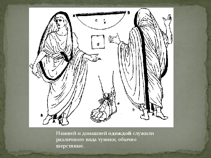 Tuunika oli alusriietus, mida kanti kodus. Stoola oli riietus, mis käis tuunikale peale. Talle oli iseloomulik suur kogus volte, vöökohalt oli tihedalt kroogitud. Üliriietuseks kasutati keepi , , Palla, , , mis oli ka tihti peakatteks. Roomlanna kehavormid olid varjatud rikkaliku trapeeringu alla. Pidulikul puhul kanti purpurset või sinist keepi. Naiste jalatsiteks kasutati sandaale värvilisest nahast.
