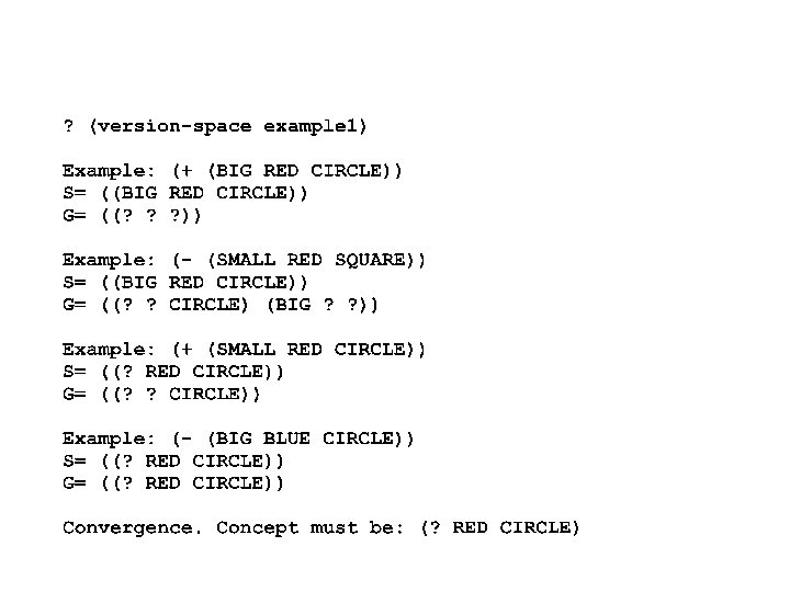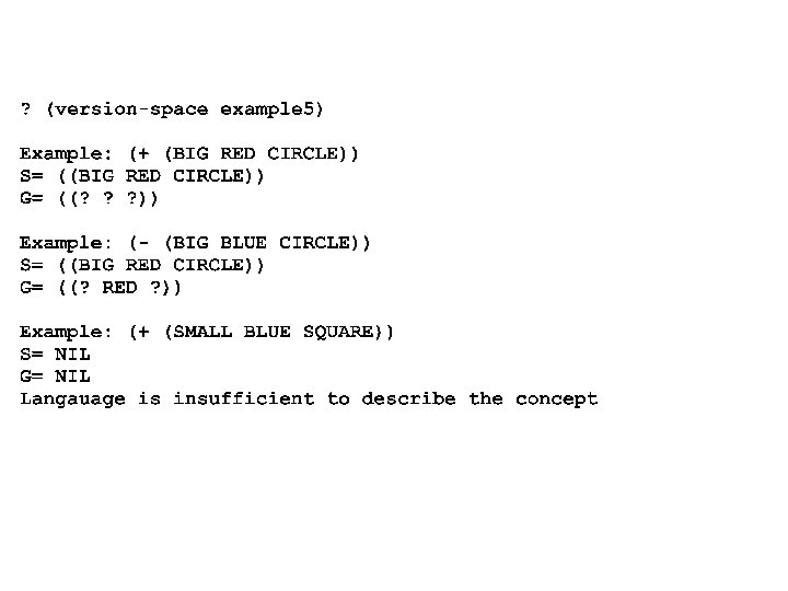 Version Space • The version space is the set of all generalizations which are consistent with all of the examples • It is described by the S and G sets: S is a generalization which is consistent with the examples and no other consistent generalization is more specific than it G is a generalization which is consistent with the examples and no other consistent generalization is more general than it