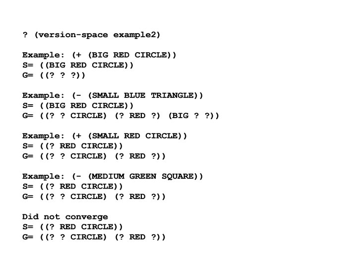 Version Space G more general consistent generalizations S + examples move S up - examples move G down more specific