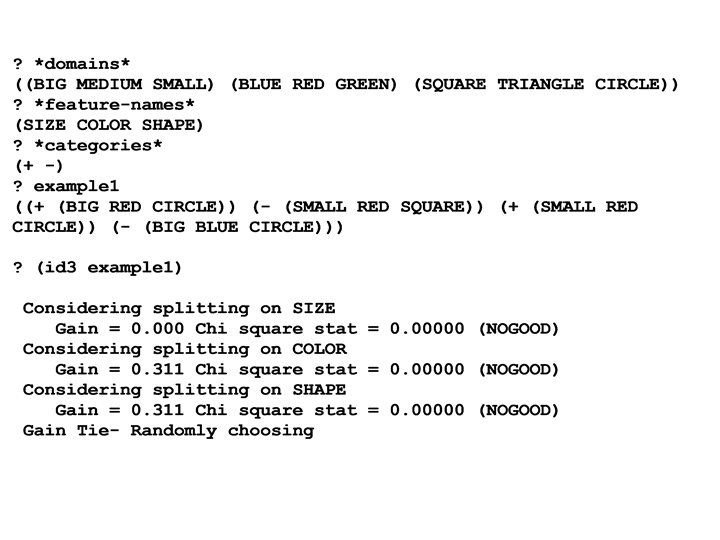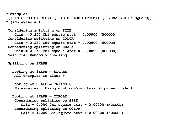 ID 3’s information theoretic measure • Picking the right feature for the root is crucial to building simple trees • Choose feature which gives the most information regarding the class of an instance: I(C): P: E(P): Information content of tree for set of instances C Feature selected as splitting node Expected information needed to complete tree given splitting on P gain(P): Information gain from feature P, gain(P) = I(C) - E(P)