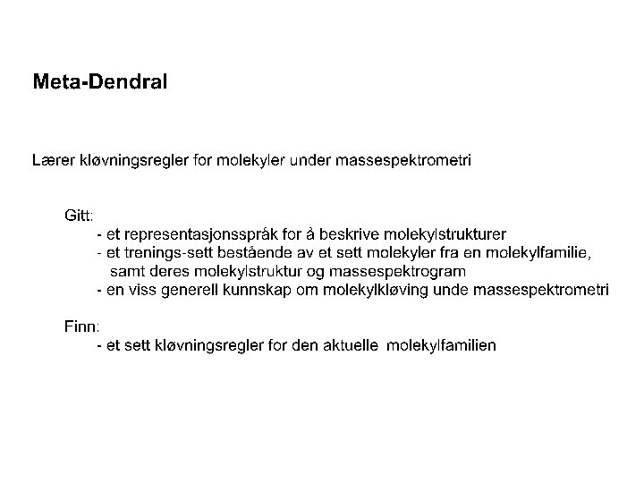 Induktive systemer i MNFIT 272: Similaritetsbaserte: Læring i Versjonsrom (VS metoden) - Inkrementell læring - Lærer kun konjunktive begreper - Lærer klassifikasjonsregel Læring av beslutningstrær (ID 3 metoden) - Alle eksempler på en gang - Lærer konjunktive og disjunktive begreper - Lærer beslutningstre Forklaringsbaserte: EBL Meta-Dendral