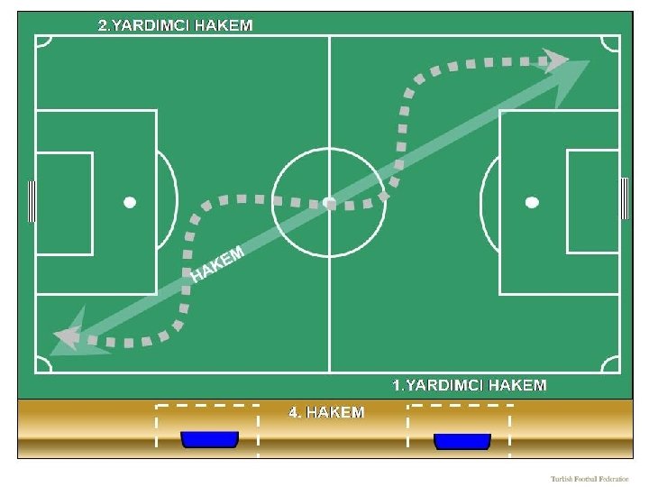 Hareketli Oyunda Yer Alma • Tavsiyeler • Oyun, hakem ile o yarı alanı kontrol eden yardımcı hakem arasında olmalıdır. • Yardımcı hakem, hakemin görüş alanı içinde olmalıdır. Hakem geniş diyagonal sistem kullanmalıdır. • Oyunun dış tarafına doğru yer almak oyunun ve yardımcı hakemin görüş alanı içinde tutulmasını daha kolaylaştırır.