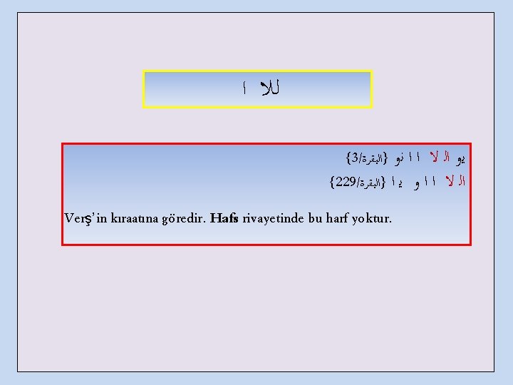 ﻟﻭ ﺍﻟ 1. ﻟ ﺍ Teshîl ile okunan “hemze” 2. ﺃ ﺍ İmâle ile okunan elif 3. ﺍﻟ ﺍ ﺍ Sâd-ı müşemmeme 4. ﻟﻼ ﺍ ﺓ Kalın Okunan Lâm –Verş’in kıraatına göre 5. ﻟ ﻭ ﺍﺍ İhfâ edilen nûn