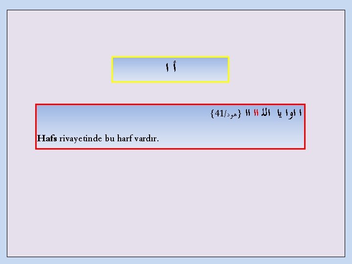ﻟﺍ a. Hemze sesi ile elif sesi arasında bir sesle okunan teshîl hemzesi {44/ }ﻓﺼﻠﺖ . . . ﻳ آﻭﺍ ﻯ ﺍ ﺍ آﺍ ﺍ ﺍﻭﺍ ﻻ آﺍ ØBu kelimede teshil yapılırken şeklinde okumamalıdır. ØHafs rivayetinde bu teshili yapmak vaciptir.