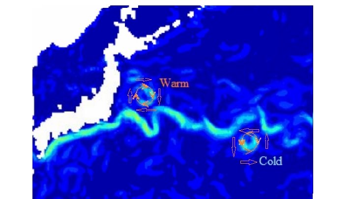 Kuroshio Current → western boundary current of the North Pacific → meanders break off when barotropic/baroclinic processes make the flow too turbulent → ultimately a way to release energy Qiu, 2001