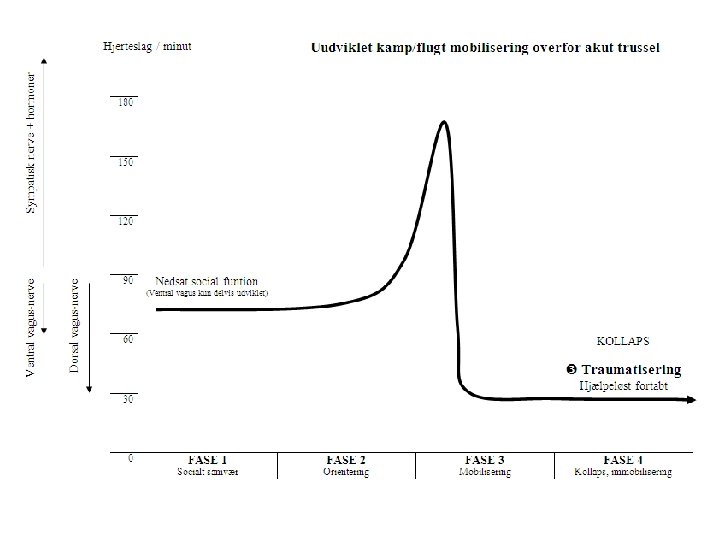 Kroppens naturlige reaktion på trussel / fare: 1. Man stopper, hvad man er i færd med. 2. Man opspænder musklerne og gør sig klar til handling (Startle response). 3. Man orienterer sig for at lokalisere sig imod og væk fra faren. 4. Forsvarsorientering: Kamp / flugt / frysning 5. Afladning af opspændt energi (Discharge) 6. Afslappethed og social kontakt. 7. Følelse af mestring, udvidelse; at føle sig i live (Pronking).