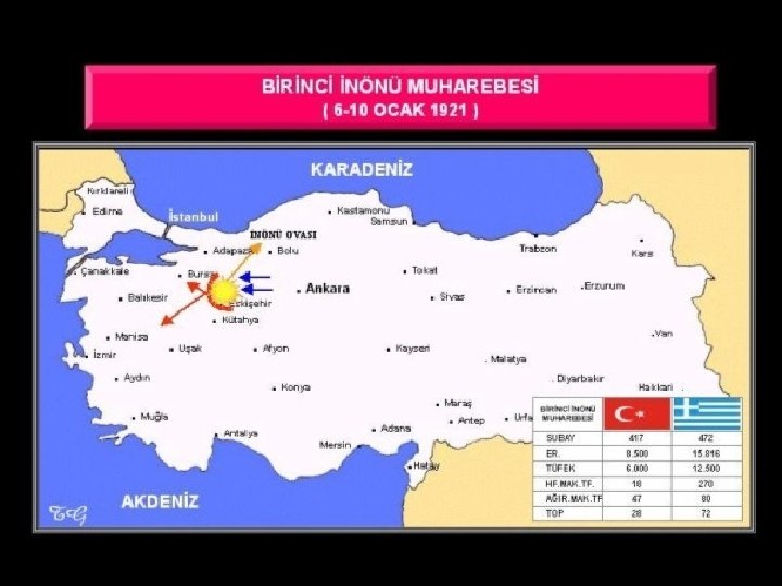BATI CEPHESİ I. İnönü Savaşı (6 -10 Ocak 1921): Sonuçları: • TBMM düzenli ordularının Batı Cephesinde kazandığı ilk askeri başarı. 1921 Anayasası kabul edilmiştir(Teşkilatı Esasi) • İstiklal Marşı kabul edilmiştir. (12 Mart 1921) • Londra Konferansı • Afganistan Dostluk Antlaşması • Moskova Antlaşması •