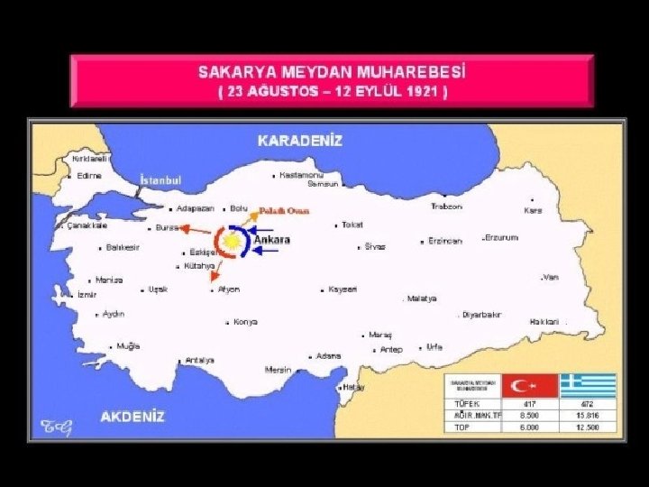 BATI CEPHESİ Kütahya-Eskişehir Savaşları (10 -25 Temmuz 1921) Sonuçları: Türk ordusu Sakarya Nehrinin doğusuna çekilmiştir. • Meclis'in Ankara'dan Kayseri'ye çekilmesi gündeme gelmiştir. • 3 ay süre ile M. Kemal'e Başkomutanlık yetkisi verilmiştir. •