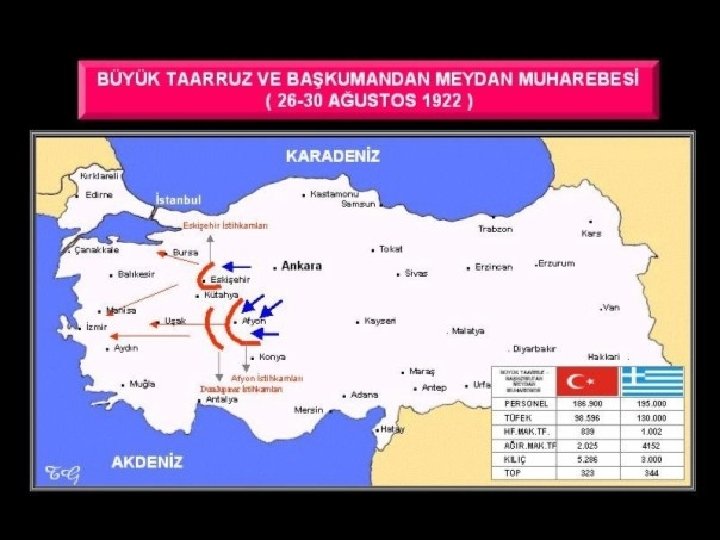 BATI CEPHESİ Büyük Taarruz (26 Ağustos 1921) Hazırlıklar: • Doğu ve Güney birlikleri Batıya aktarıldı. • Sovyet Rusya büyük yardımlar yaptı. Başkomutanlık yetkisi sınırsız uzatıldı. Sonuçlar: • Mudanya Ateşkes Antlaşması(11 Ekim 1922) • Saltanat'ın kaldırılması (1 Kasım 1922) • Lozan Barış Antlaşması (24 Temmuz 1923) •