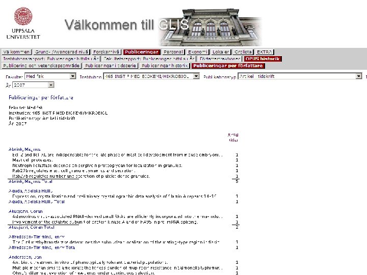 Databaser där GLIS hämtar data • Uppdok (studerandedata) • Selma (kursdata) • Raindance (ekonomi) • Primula (personal) • Klas (lokaler) • Di. VA (publiceringar)