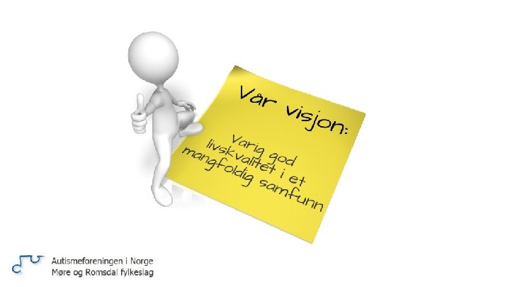Kven er vi – og kva gjer vi Autismeforeningen i Norge er ei samanslutning av personar med autismespekterdiagnose (ASD), foreldre/føresette, pårørende, fagfolk og andre interesserte. Ca 520 medlemmer i vårt fylke. Viktige oppgåver i vårt arbeid: • Medlemsretta arbeid for å bidra til å skape treffpunkt, nettverk og aktivitet for personar med ASD og familiene deira. • Likepersonsarbeid for å bidra til kvardagsmeistring og forebygge psykiske tilleggsvanskar. • Opplysingsarbeid, for å auke kunnskap, forståing og aksept for personar med ASD. • Interessepolitikk for å oppnå likeverdig deltaking i samfunnet for personar med ASD og familiene deira.