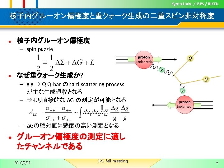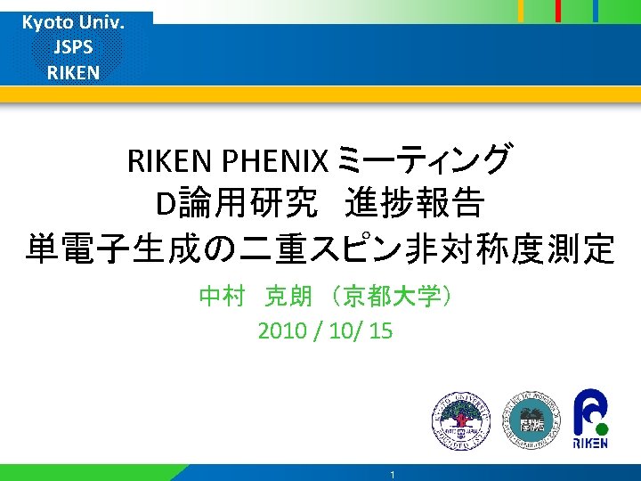 Kyoto Univ. / JSPS / RIKEN expected error bar of ALL 非対称度の理論曲線 と予想統計誤差 fitting result (sect 8 north) 0. 75 < pt < 1. 00 Ge. V/c ε = S/(S+N) ~10 -3 ~10 -2 ~10 -3 accept region 2010/9/11 efficiency turn on curve assumption PB = 57%, PY = 57% eff(non-photonic) = 80% eff(photonic) = 30% eff(fake hit) = 40% JPS fall meeting 23