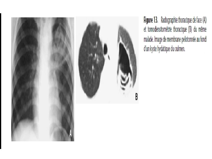 Biologie • L’hémogramme au stade de kyste avéré montre une L’hémogramme éosinophilie (non spécifique) de 7 à 15%, qui est éosinophilie (non spécifique) augmentée lors des ruptures de kystes. • La mise en évidence directe d’éléments parasitaires (protoscolex, fragments membranaires, crochets) est possible dans les crachats, dans le liquide de vomique ou d’aspiration bronchique en cas de rupture du KH dans les bronches, • Le diagnostic immunologique peut être basé sur la détection des réponses immunitaires (humorales et cellulaires) de l’hôte vis à vis du parasite. Les réactions sérologiques sont nombreuses, leur sensibilité et leur spécificité dépendent de la valeur de l’antigène utilisé