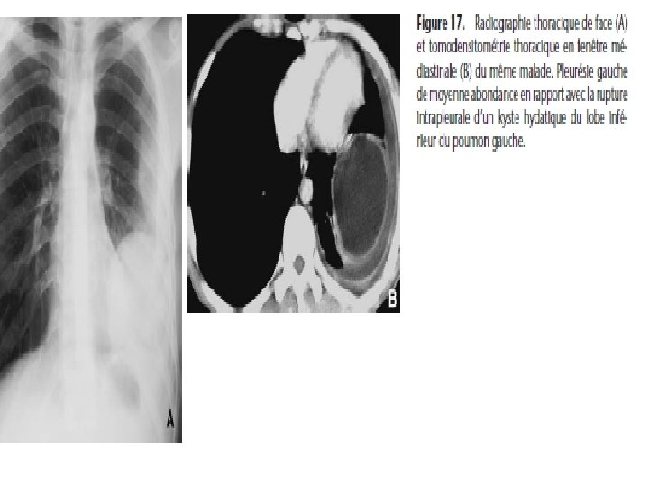 6) Rupture dans les séreuses: - hydatido-pneumothorax se transformant rapidement en hydatido-pyopneumothorax (parfois choc pleural et choc anaphylactique) RX= épanchement mixte liquidien et aérien, avec un niveau liquide généralement ondulé par les vésicules filles qui surnagent à la surface du liquide - Kyste hydatique rompu dans la cavité péricardique (mort brutale par choc anaphylactique et par tamponade)