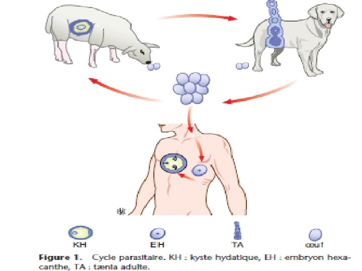 Cycle Le chien s’infeste en dévorant les viscères Le chien s’infeste hydatifères du mouton ou autre herbivore hydatifères du mouton contaminé. Les scolex ingérés donneront des ténias adultes 6 semaines après la contamination.