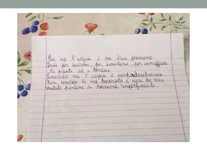 Indagine sulle conoscenze pregresse Cos’è per te l’acqua? A cosa serve? Secondo te è importante? Conosci alcune sue proprietà? Hai mai sentito parlare di tensione superficiale?