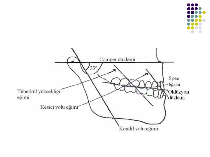 l Artikülasyon kanunları: 1. 2. 3. 4. 5. Kondil yolu eğimi Kesici yolu eğimi Kompansasyon eğrisi (Spee) Oriyantasyon düzlemi Tüberkül eğimleri