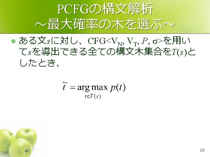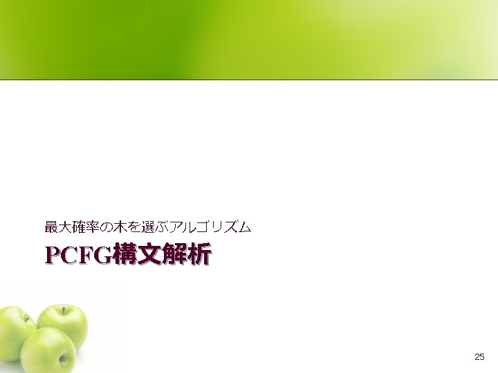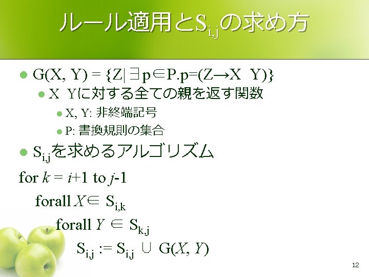 CKY法 l 矢印の順で全てのSi, jが求まる S 0, 6 S 0, 5 S 0, 4 S 0, 3 スタート 0 S 0, 2 S 0, 1 w 1 S 1, 5 S 1, 4 S 1, 3 S 1, 2 1 w 2 S 1, 6 S 2, 5 S 2, 4 S 2, 3 2 S 2, 6 w 3 S 3, 6 S 3, 5 S 3, 4 3 w 4 S 4, 6 S 4, 5 4 w 5 S 5, 6 5 w 6 6 11