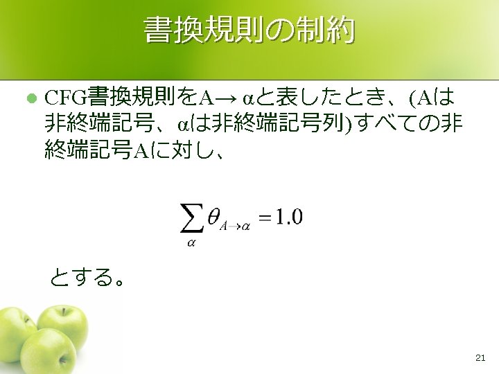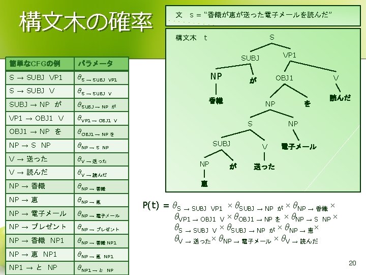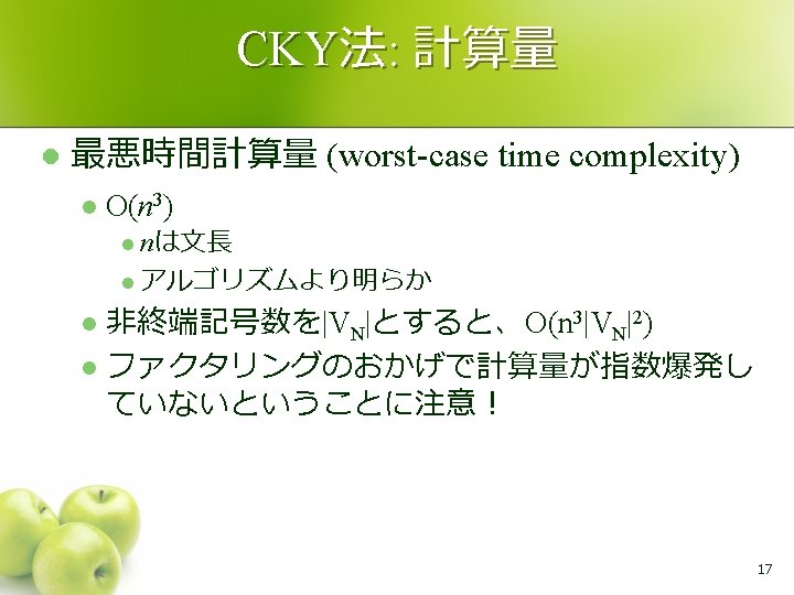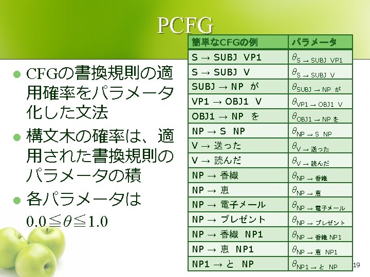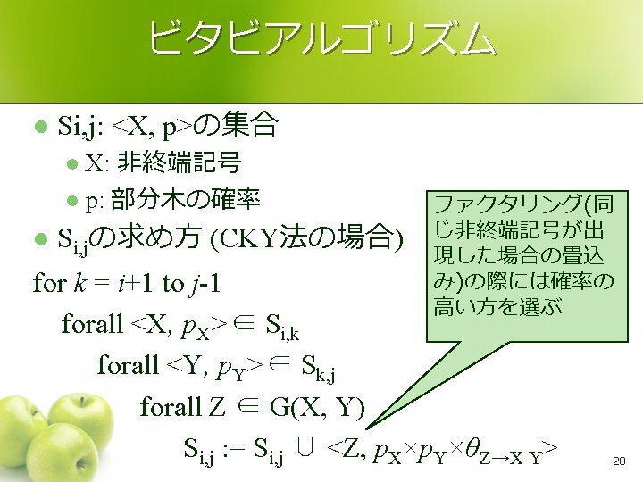 文法 CKY法 l S → NP VP VP → VP PP VP → V NP VP → V 例 NP → NP PP NP → John S NP → Mary 0, 6 PP → P NP VP 0, 5 P → with 1, 6 NP → DT NP NP S 0, 4 1, 5 DT → a 2, 6 PP 0, 3 1, 4 2, 5 0 John sees 2, 4 NP 2, 3 1, 2 1 NP 1, 3 V NP 0, 1 2 V → sees 3, 6 VP 0, 2 NP → telescope Mary 3 3, 5 V → runs 4, 6 P DT NP 3, 4 4, 5 5, 6 with 4 a 5 telescope 6 15