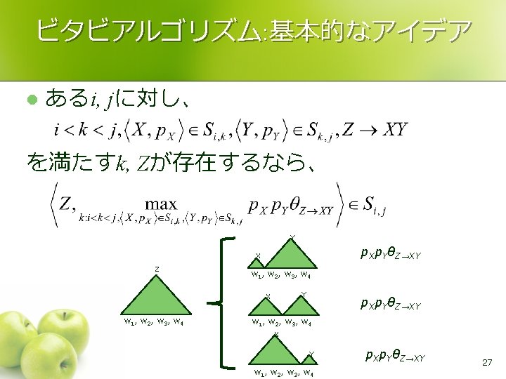 CKY法: 基本的なアイデア l Z→X Y Y X Z w 1 , w 2 , w 3 , w 4 Y X w 1 , w 2 , w 3 , w 4 X Y w 1 , w 2 , w 3 , w 4 10