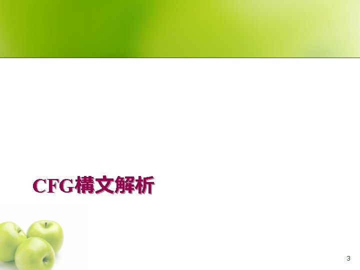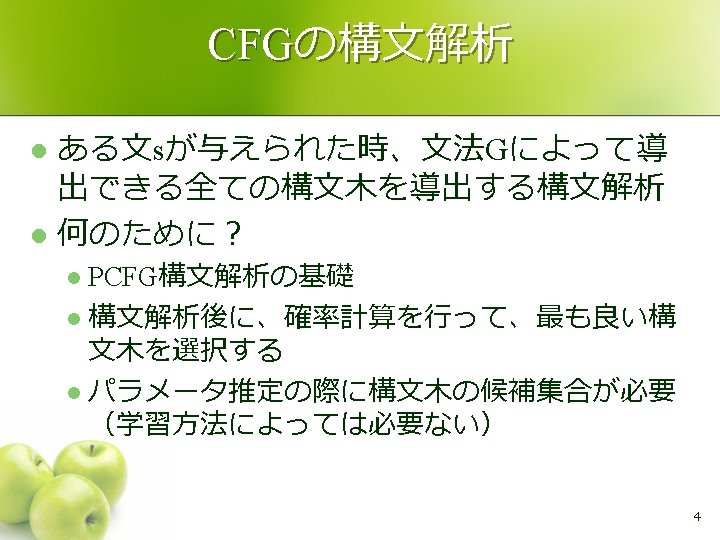 今日の講義の予定 l CFGの構文解析 l l l CKYアルゴリズム PCFGの構文解析 l CKYアルゴリズム+ビタビアルゴリズム l 北研二(著) 辻井潤一(編) 言語と計算 4 確率的言語モデル 東大 出版会 C. D. Manning & Hinrich Schütze “FOUNDATIONS OF STATISTICAL NATURAL LANGUAGE PROCESSING” MIT Press, 1999 D. Jurafsky, J. H. Martin, A. Kehler, K. V. Linden & N. Ward “Speech and Language Processing: An Introduction to Natural Language Processing, Computational Linguistics, and Speech Recognition” Prentice Hall Series in Artificial Intelligence, 2000 教科書 l l 2