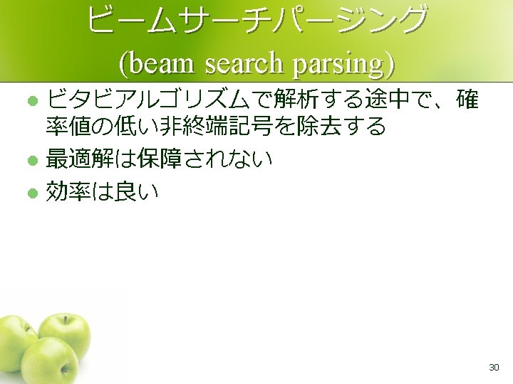 ビタビアルゴリズム <VP, 0. 03> l例 <VP, 0. 008> をファクタリングす る際は <VP, 0. 03> と確率値の高い方を 残す 0, 6 1, 6 <NP, 0. 00016> 1, 5 <S, 0. 0008> 2, 6 <PP, 0. 008> 1, 4 2, 5 3, 6 <VP, 0. 008> 0, 2 <NP, 0. 05> 3, 5 4, 6 <NP, 0. 1> <V, 0. 5> <NP, 0. 2> <P, 1. 0> <DT, 1. 0><NP, 0. 2> 0, 1 1, 2 2, 3 3, 4 4, 5 5, 6 0 1 2 3 4 5 6 John 1, 3 NP <VP, 0. 03> <VP, 0. 008> 0, 5 0, 4 0, 3 0. 5× 0. 2×θVP→V =0. 01× 0. 8 =0. 008 sees 2, 4 Mary with a telescope 29