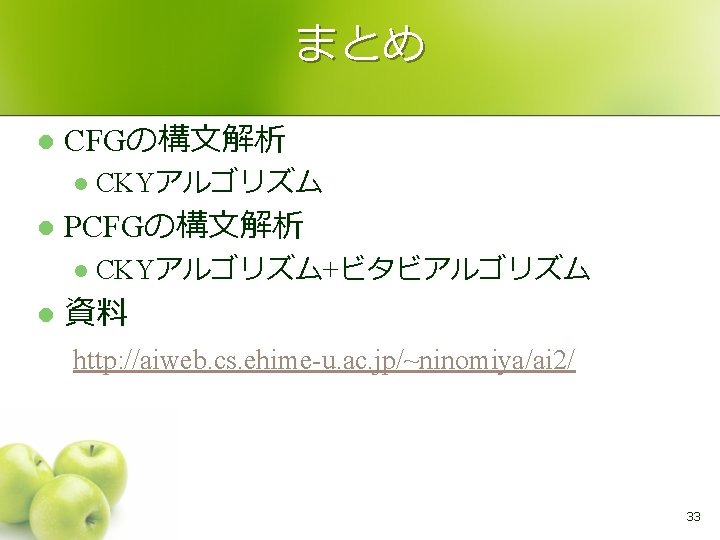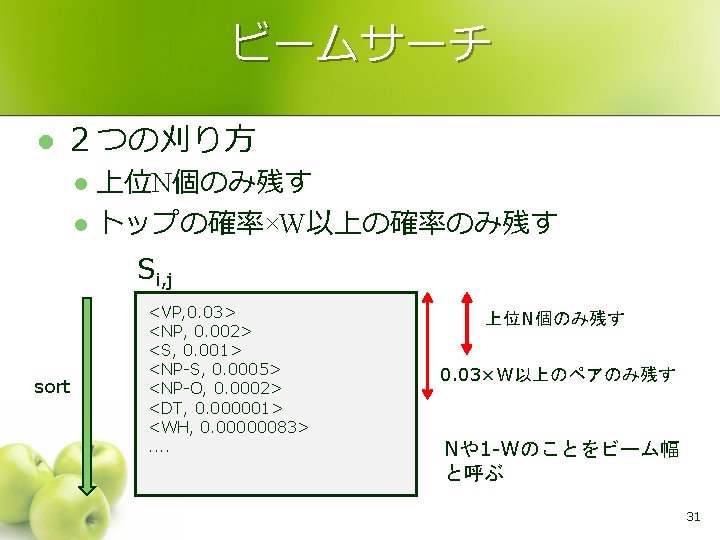 ビームサーチ N: 数による閾値 l W: 幅による閾値 l Si, jの求め方 (CKY法の場合) for k = i+1 to j-1 forall <X, p. X>∈ Si, k forall <Y, p. Y>∈ Sk, j forall Z ∈ G(X, Y) Si, j : = Si, j ∪ <Z, p. X×p. Y×θZ→X Y> sort Si, j according to its p (Si, j=<X 1, p 1>. . . <XM, p. M>とする) remove <XN+1, p. N+1>. . . <XM, p. M> remove <X, p> ∈ Si, j s. t. p < p 1×W l 32