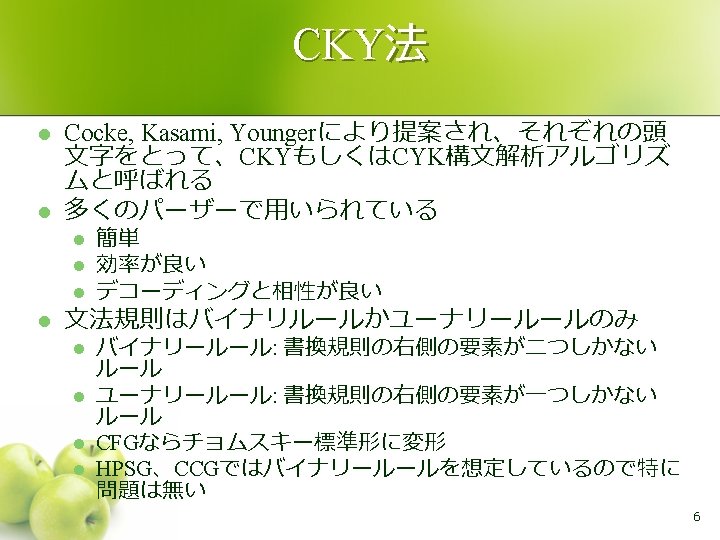 CFG構文解析のアルゴリズム l トップダウン型 l l アーリー法 (earley parsing algorithm) ボトムアップ型 CKY法 (CKY parsing algorithm, CYK法ともいう ) l チャート法 (chart parsing algorithm) l 左隅解析法 (left-corner parsing algorithm) l l 一般化LR法 (generalized LR parsing) 5