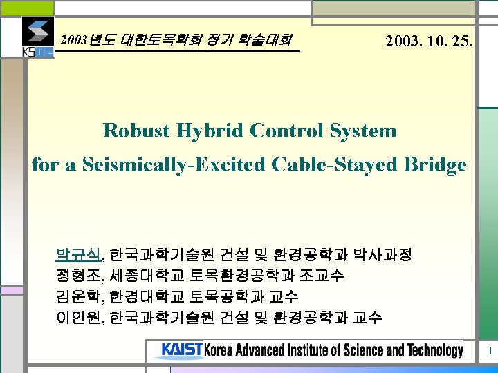 Numerical examples • Maximum variations of evaluation criteria for all three earthquake (%, 5% perturbation) Evaluation criteria CHCS RHCS III J 1. Max. base shear 9. 75 10. 34 9. 20 7. 69 J 2. Max. deck shear 16. 62 16. 26 4. 42 14. 34 J 3. Max. base moment 16. 68 15. 97 4. 93 5. 01 J 4. Max. deck moment 4. 46 5. 37 6. 21 8. 91 J 5. Max. cable deviation 13. 08 14. 22 13. 96 15. 68 J 6. Max. deck dis. 7. 51 4. 06 1. 48 3. 52 J 7. Norm base shear 50. 00 6. 54 6. 12 7. 02 J 8. Norm deck shear 139. 17 7. 94 4. 93 10. 68 J 9. Norm base moment 39. 94 5. 98 5. 54 10. 36 J 10. Norm deck moment 42. 15 10. 37 7. 56 21. 82 J 11. Norm cable deviation 41. 32 18. 65 13. 78 30. 31 16