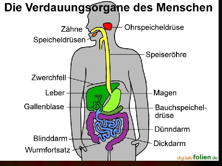 Unser Verdauungssystem l Unsere Nahrung wird im Mund zerkleinert, durch die Speiseröhre kommt sie in den Magen. Dort wird sie mit Pepsin und Salzsäure angereichert und durchgeknetet. Im Dünndarm kommt Gallenflüssigkeit hinzu, die in der Leber erzeugt wird. Diese Flüssigkeit bleibt zunächst in der Gallenblase, bis sie im Darm gebraucht wird. Dort verdaut sie Fette. Die Bauchspeicheldrüse erzeugt Enzyme, wodurch die Nahrungsbestandteile weiter zerlegt werden. Im Dickdarm wird dem unverdaulichen Rest noch Wasser entzogen. Dann wird er durch den After ausgeschieden.