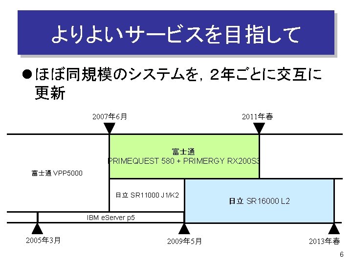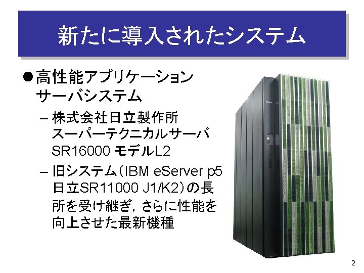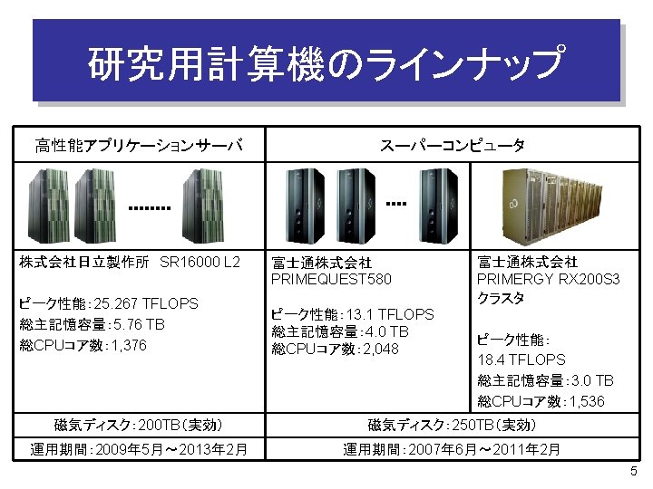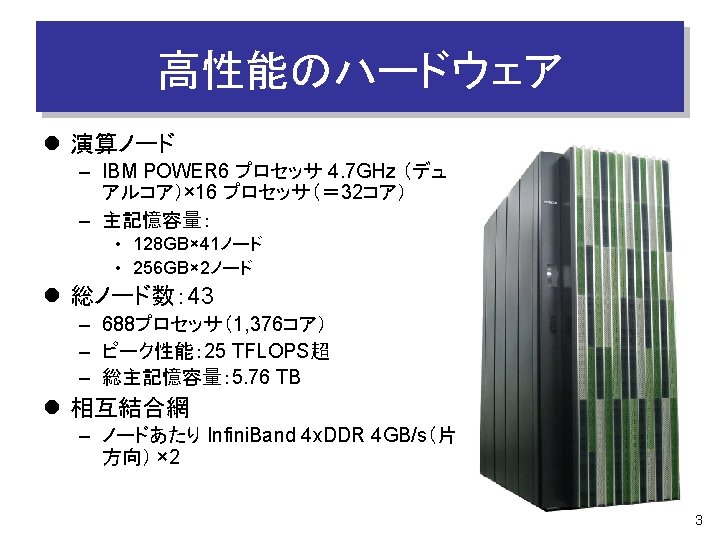 充実したソフトウェア l プログラミング言語処理系 – 日立最適化Fortran 90 – IBM XL Fortran,XL C/C++ l 科学技術計算ライブラリ – MATRIX/MPP,MATRIX/MPP/SSS,MSL 2 – IBM ESSL,IBM Parallel ESSL l 科学技術計算アプリケーション – – – Gaussian,GAMESS,Molpro,AMBER,SYBYL,VASP,PHASE MSC Marc/Mentat,MSC/Nastran,MSC/Patran Ensight MUMPS SAS 4