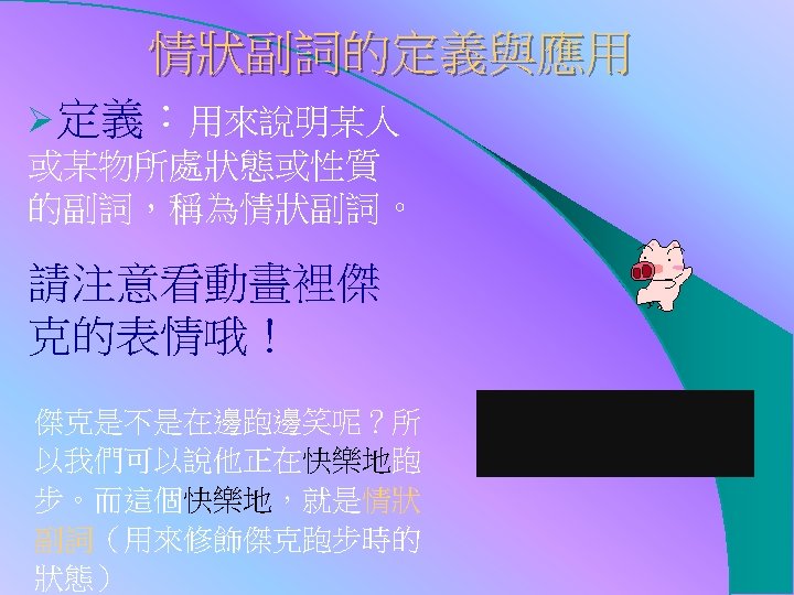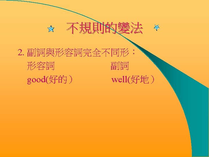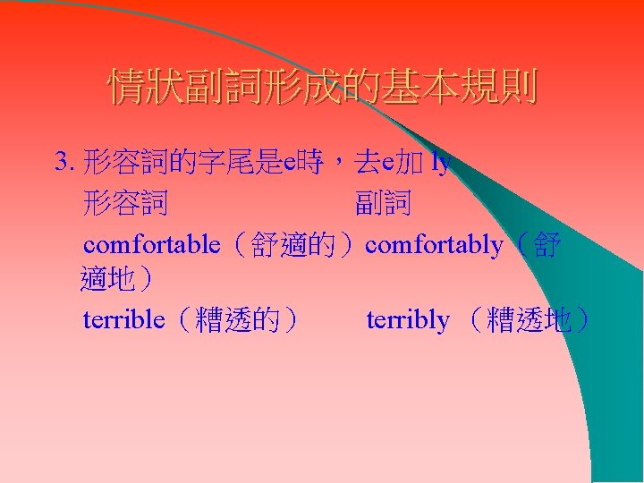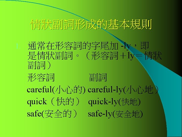 牛刀小試 先動動腦筋,再看答案哦 ! l He can speak English (good). l It rained (heavy)last night. l She is sitting (comfortable) on a sofa. l I usually get up (early) to catch the early bus. l Because the weather is (terrible) hot, I sweat a lot. He can speak English well. It rained heavily last night She is sitting comfortably on a sofa I usually get up early to catch the early bus Because the weather is terribly hot, I sweat a lot.
