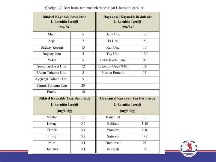 L karnitinin Doğadaki Kaynakları • Bitkisel besinler az miktarda L karnitin içerirken, hayvansal besinler L karnitin açısından daha zengindir. • İnsan vücudunda iskelet kası, kalp, karaciğer, böbrek ve beyin dokuları L karnitin biyosentezi yapabilmektedir.