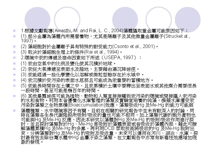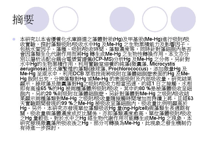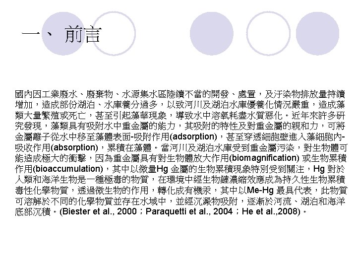 五、 參考文獻 l l l l l 1. Biester, H. , Schuhmacher, P. , Müller, G. , “Effectiveness of mossy tin filters to remove mercury from aqueous solution by Hg(II) reduction and Hg(0) amalgamation, ” Water Research, Vol. 34, Iss. 7, pp. 2031 -2036 (2000). 2. Paraquetti, H. H. M. , Ayres, G. A. , Almeida, M. D. de, Molisani, M. M. and Lacerda, L. D. de, “Mercury distribution, speciation and flux in the Sepetiba Bay tributaries, SE Brazil, ” Water Research, Vol. 38, Iss. 6, pp. 1439 -1448 (2004). 3. He, T. , Feng, X. , Guo, Y. , Qiu, G. , Li, Z. , Liang, L. and Lu, J. , “The impact of eutrophication on the biogeochemical cycling of mercury species in a reservoir: A case study from Hongfeng Reservoir, Guizhou, China, ” Environmental Pollution, Vol. 154, Iss. 1, pp. 56 -67 (2008). 4. Awasthi, M. and Rai, L. C. , “Adsorption of nickel, zinc and cadmium byimmobilized green algae and cyanobacteria: a comparative study, ” Annals of microbiology, Vol. 54, No. 3, pp. 257 -267 (2004). 5. Struck, B. D. , Pelzer, R. , Ostapczuk P. , Emons H. and Mohl C. , “Statistical evaluation of ecosystem properties influencing the uptake of As, Cd, Co, Cu, Hg, Mn, Ni, Pb and Zn in seaweed (Fucus vesiculosus) and common mussel (Mytilusedulis), ” The Science of The Total Environment, Vol. 207, Iss. 1, pp. 29 -42 (1997). 6. Csonto, J. , Kadukova, J. and Polak, M. , “Artificial life simulation of living alga cells and its sorption mechanisms, ” Journal of Medical Systems, Vol. 25, Iss. 3, pp. 221 -231 ( 2001). 7. Rai, L. C. , Gaur J. P. and Soeder C. J. (ed. ), “Algae and Water Pollution, ” E. Schweizerbart’sche Verlagsbuchhandlung science, Advances in Limnology, Germany, Vol. 42, pp. 1 -29 (1994). 8. USEPA (U. S. Environmental Protection Agency), ”Mercury Study Report to Congress, ” Vol. 1, Executive Summary, EPA-452/R-97 -003, (Washington: GPO) (1997). 9. Taylor GJ, Crowder A. A. “Use of the DCB technique for extraction of hydrous ironoxides from roots of wetland plants, ” Amer. J Bot. ; 70, pp. 1254– 1257. 23 (1983).