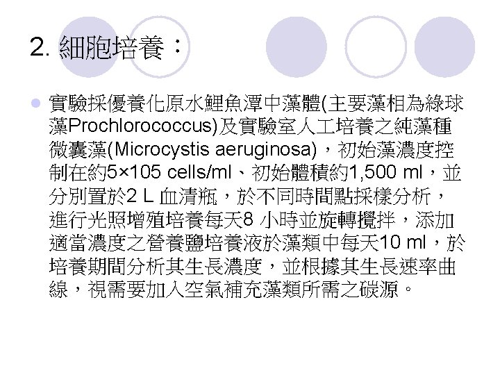 二、研究方法 l l l l 1. 實驗材料、設備及藥品 (1) 感應耦合電漿質譜儀(Inductively Coupled Plasma Mass Spectrometry,ICP-MS) (Perkin Elmer Sciex ELAN DRCⅡ) (2) 旋轉攪拌器(Kansin Instruments Co. , Ltd. , Taiwan) (3) 場發射掃描電子顯微鏡(Field-emission scanning electron microscope,FESEM) (JEOL JSM-6700 F Oxford inca energy 400) (4) 湯瑪氏血球計數盤(Thomas haemacytometer)(Neubauer Improved Bright-Line Marienfeld,Germany) (5) 螢光顯微鏡(Nikon Eclipse E 600) (6) 微波消化(MARS-5, CEM) (7) 高效能液相層析儀(High Performance Liquid Chromatograph , HPLC)( Perkin Elmer Series 200 pump)
