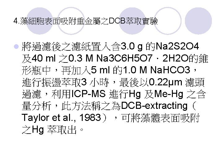l l l l (8) 汞標準品(Mercury standard solution):Mercury (II) nitrate in nitric acid 0. 5 mol/L(Merck,Germany) (9) 甲基汞標準品(Methylmercury-chloride):purity≧ 95. 5%(Dr. Ehrenstorfer,Merck,Germany) (10) Na. HCO 3(Sodium Bicarbonate) purity≧ 99%(GR 級,OSAKA, Japan) (11) Na 3 C 6 H 5 O 7.2 H 2 O(Sodium Citrate):purity≧ 99%(GR 級, OSAKA,Japan) (12) Na 2 S 2 O 4(Sodium Hydrosulfite):purity≧ 99%(GR 級,OSAKA, Japan) (13) 低汞硝酸(GR 級,E-Merck,Germany) (14) 戊二醛(Fluka,USA)
