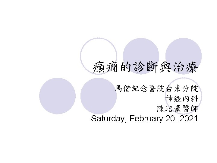 致死率 在年輕成人族群,死亡率是同年齡層的三倍 l 統計上,平均減少壽命可高達 18年 l 死亡與下列情形有關 l ¡ ¡ ¡ An underlying brain disease, such as a tumor or infection; Seizures in dangerous circumstances, leading to drowning, burns or head injury, for example; Status epilepticus; Sudden and unexplained causes, or a possible respiratory or cardio-respiratory arrest during a seizure; Suicide.