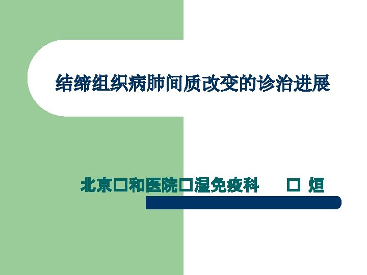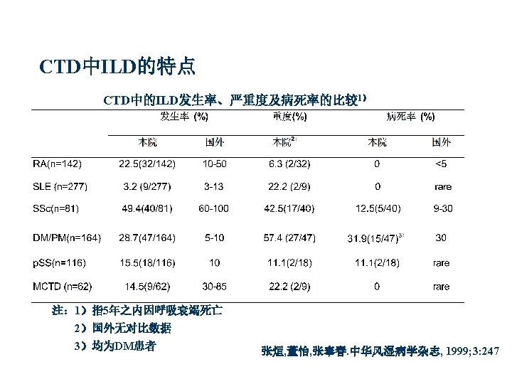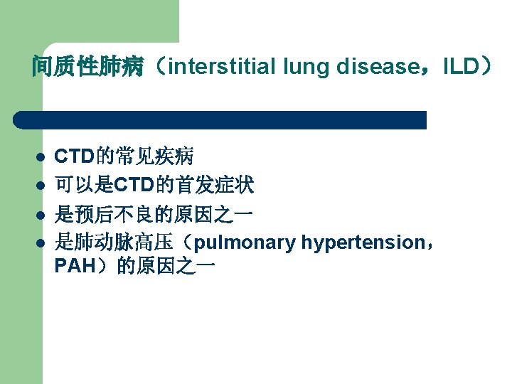 ILD的发生率 l l l 15%的CTD合并ILD 70% SSc合并肺部病变,2年内可发展为ILD, 组织病理77. 5%SSc伴ILD 10%DM/PM合并ILD 胸片显示 3. 7%RA合并ILD SLE,SS,MCTD Clin Chest Med 2004; 25: 549 ~ 559 Am J Respir Crit Care Med 2002; 165: 1581 ~ 6 Ann Rheum Dis 2003 ; 62 : 897 ~ 900