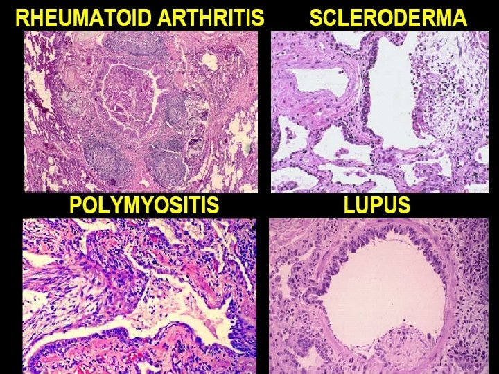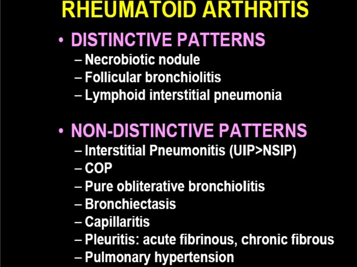 HRCT a patient with RA 33% of with RA associated parenchymal lung disease 31 IPF Radiography: 2 -6% 29 HRCT: 10% - 47% 35 -8 HRCT: 50% with broncioectases and bronchiolectasis