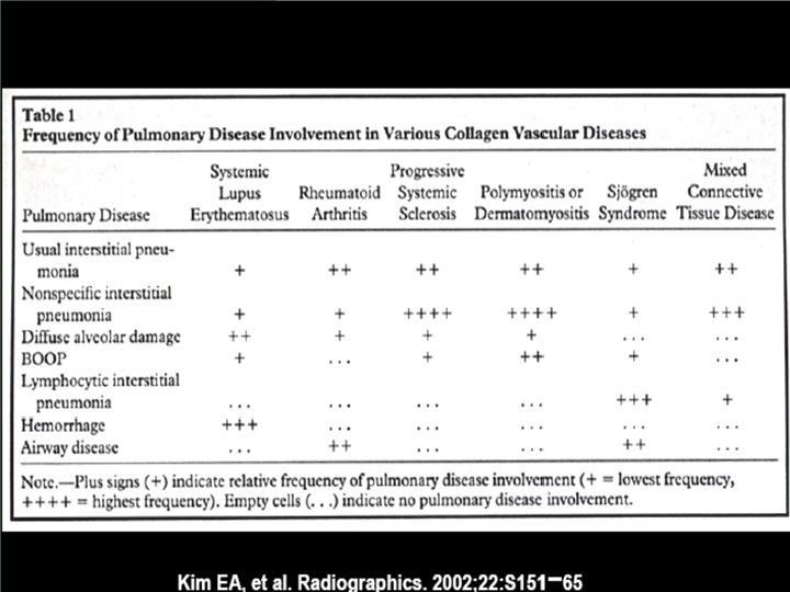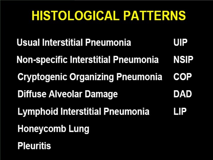ILD的分类 易发生的疾病 非特异性间质性肺炎(NIP) SSc PM/DM RA SLE SS MCTD 寻常型间质性肺炎(UIP) RA SSc PM/DM SS 机化型肺炎(OP) PM/DM RA SSc SLE SS 淋巴细胞浸润性肺炎(LIP) SS SLE RA MCTD 脱屑性间质性肺炎(DIP) SLE RA SSc 弥漫性肺泡炎(DAD) SLE SSc PM/DM RA MCTD Curr Opin Rheumtol 2004; 16: 186 ~ 191