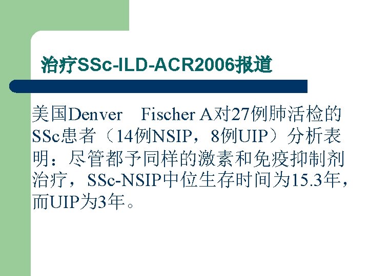 治疗 l ILD 治疗的中心问题是GC和免疫抑制的指征 GC是最常用药,众多病人无反应 预后取决于分型 GC+CTX疗效好于单用GC Am J Respir Crit Care Med 1996; 154: 400 Arthritis Rheum 1994; 37: 1290 Semin Arthritis Rheum 2003; 32: 273