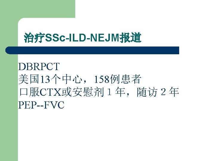 治疗SSc-ILD-NEJM结论 ØOne year of oral CTX in symptomatic SSc. ILD had a significant but modest beneficial effect on lung function, dyspnea, thickening of the skin, and the health-related quality of life. ØThe effects on lung function were maintained through the 24 ms of the study.