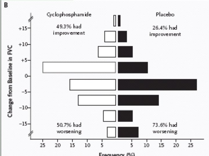 治疗SSc-ILD-NEJM报道 Of 158 patients, 145 completed at least six months of treatment and were included in the analysis. ØThe mean absolute difference in adjusted 12 month FVC% predicted between the CTX and placebo groups was 2. 53% (95%CI 0. 28 to 4. 79%), favoring CTX (P<0. 03).