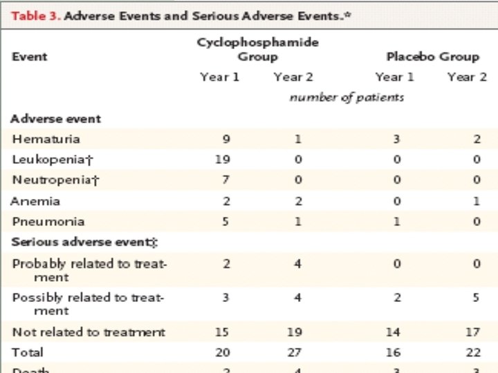 治疗SSc-ILD-NEJM报道 ØThere were also treatment-related differences in physiological and symptom outcomes, and the difference in FVC was maintained at 24 months. ØThere was a greater frequency of adverse events in the CTX group, but the difference not significant.