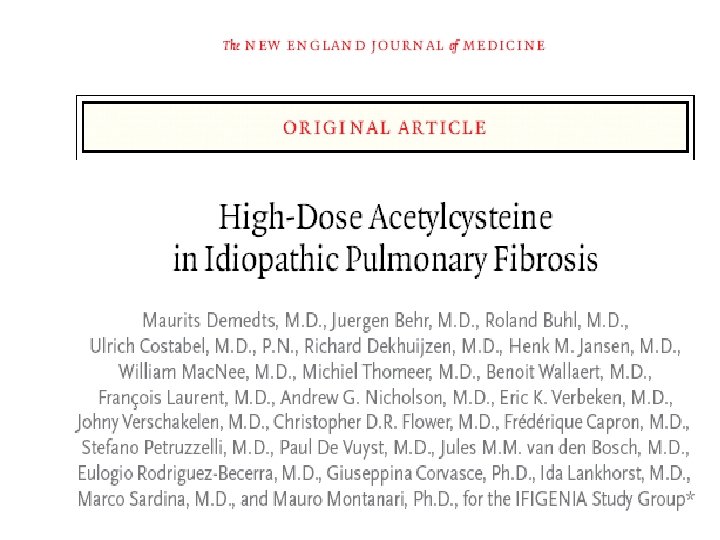 l l 182 patients (92 to NAC and 90 to placebo). 155 (80 NAC and 75 placebo) had UIP, as confirmed by HRCT and histologic findings reviewed by expert committees, and did not withdraw consent before the start of treatment.