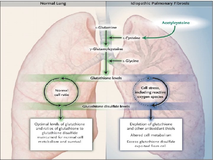 治疗-IPF启示 Ø Ø Ø The synthesis of glutathione can be accelerated by the administration of NAC, which crosses cell membranes easily and can be converted to l-cysteine. Uptake of l-cysteine is an important ratelimiting step for the synthesis of glutathione. NAC increases the pool of other antioxidant thiols that also protect cells from injury.