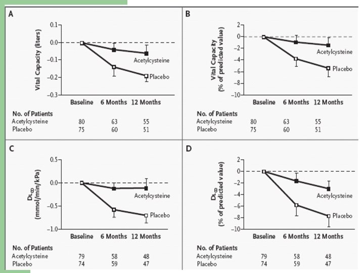 l l 57/80 taking NAC (71%) and 51/75 taking placebo (68%) completed one year of treatment. NAC slowed the deterioration of VCand Dlco at 12 months, absolute differences in the change from baseline between patients taking NAC and those taking placebo were 0. 18 liter (95%CI, 0. 03 to 0. 32), relative difference of 9% , for VC(P=0. 02), and 0. 75 mmol per minute per kilopascal (95%CI, 0. 27 to 1. 23), or 24%, for Dlco(P=0. 003).