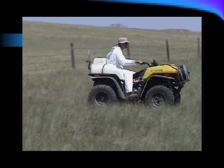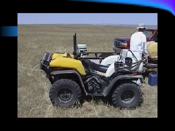 ATV - RAATS l Chemicals: u u u Dimilin 2 L (1 oz/A) Sevin XLR (16 oz/A) Malathion (8 oz/A) l Recommendations u u u Minimum of 20% acreage is sprayed Percent Coverage = hoppers density/ sq yd Ex: Average 30 hoppers/sq yd then 30% coverage • If swath width is 15 ft. 15/0. 3 = 50 ft: Treat 1 swath every 50 ft u Example: 40 grasshoppers/sq yd you need 40% coverage. • If 15 ft swath then 15 ft/40% means spraying a swath every 37. 5 feet l Results u u Reduce insecticide by 60 -80% Focus treatment on more productive areas