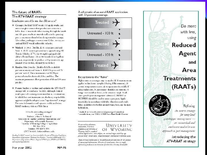 RAATS Concept l Reduced Area & Agent Treatment Acreage u Insecticide u l Hoppers killed directly in treated areas l Hoppers move into treated strips u 1 -3 miles/day l Less disruption of natural enemies