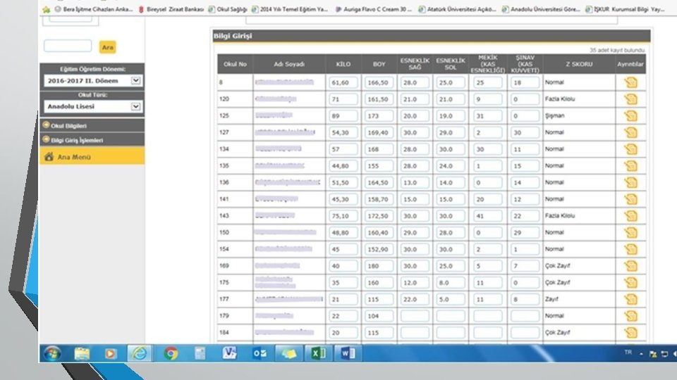 Tarama Verileri e- okul sistemine girilmeli • Öğrencilerin okul/kurumda yapılan sağlık -muayene ve taramaları sonucunda elde edilen sağlık verileri; • Boy uzunluğu/vücut ağırlığıölçümleri, • Tarama sonuçları, • Aşılama bilgileri vb. e-okul sistemine girilmeli, takip edilmeli ve velilerle paylaşılmalıdır.
